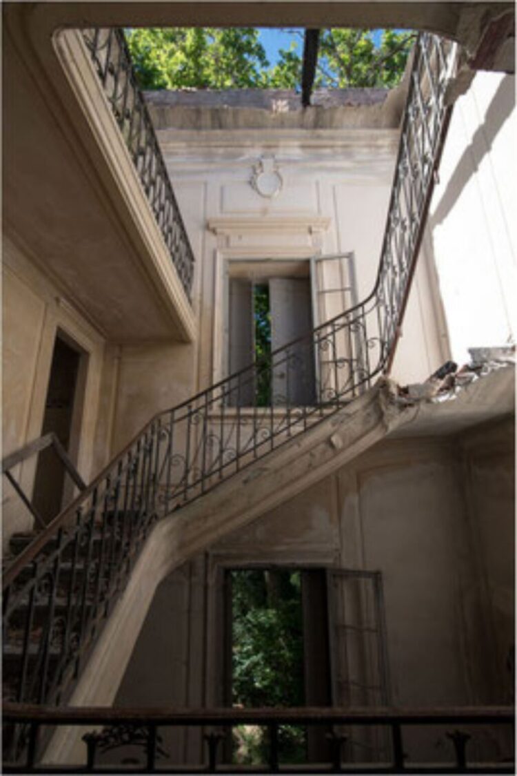 Au fond, quelques éléments du domaine subsistent : une cheminée, un escalier en , des poutres noircies.