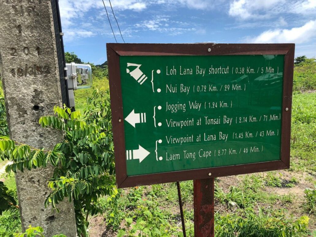 Un petit détour (30 bahts d’entrée, soit environ 0,90 €) nous a permis de franchir cette dernière étape. Juste avant le troisième point de vue, un panneau délavé indiquait un sentier menant à la baie de Loh Lana.