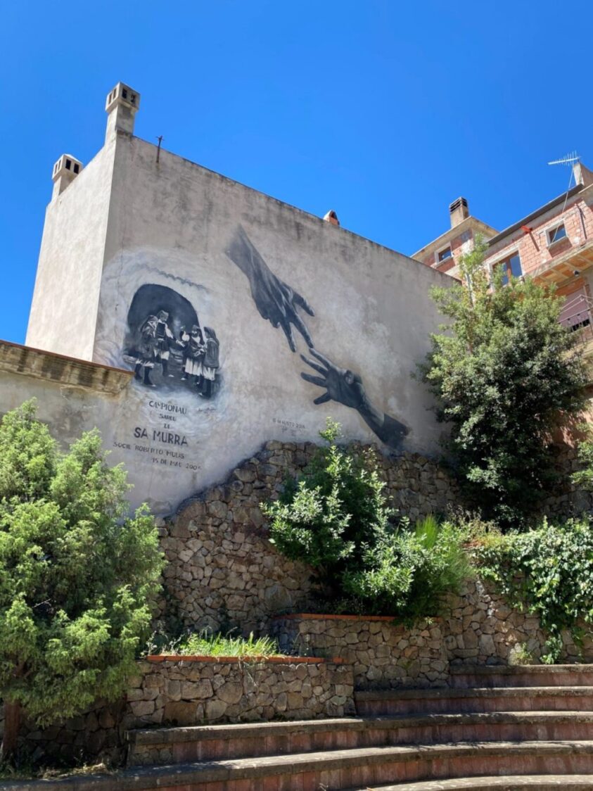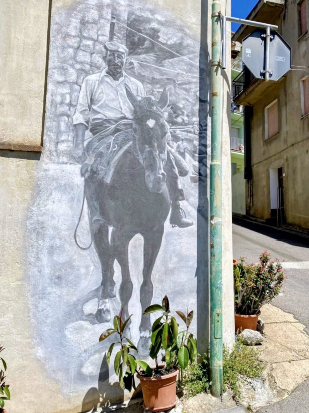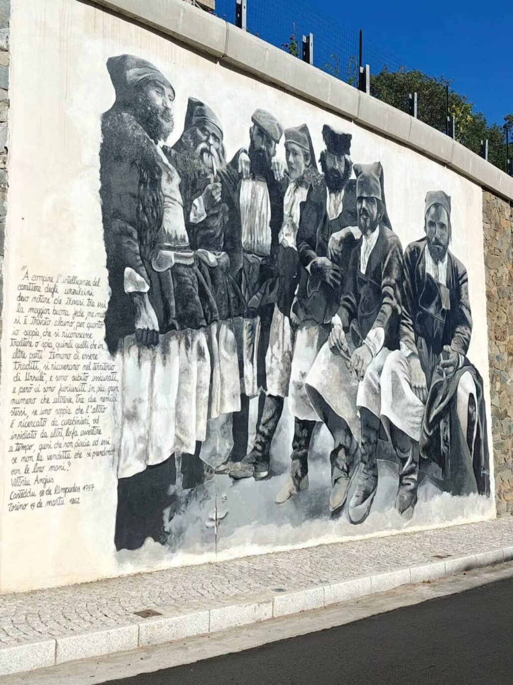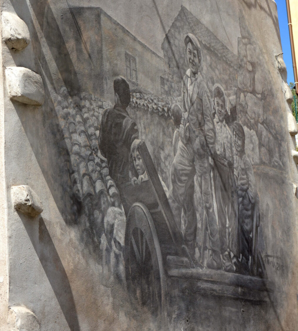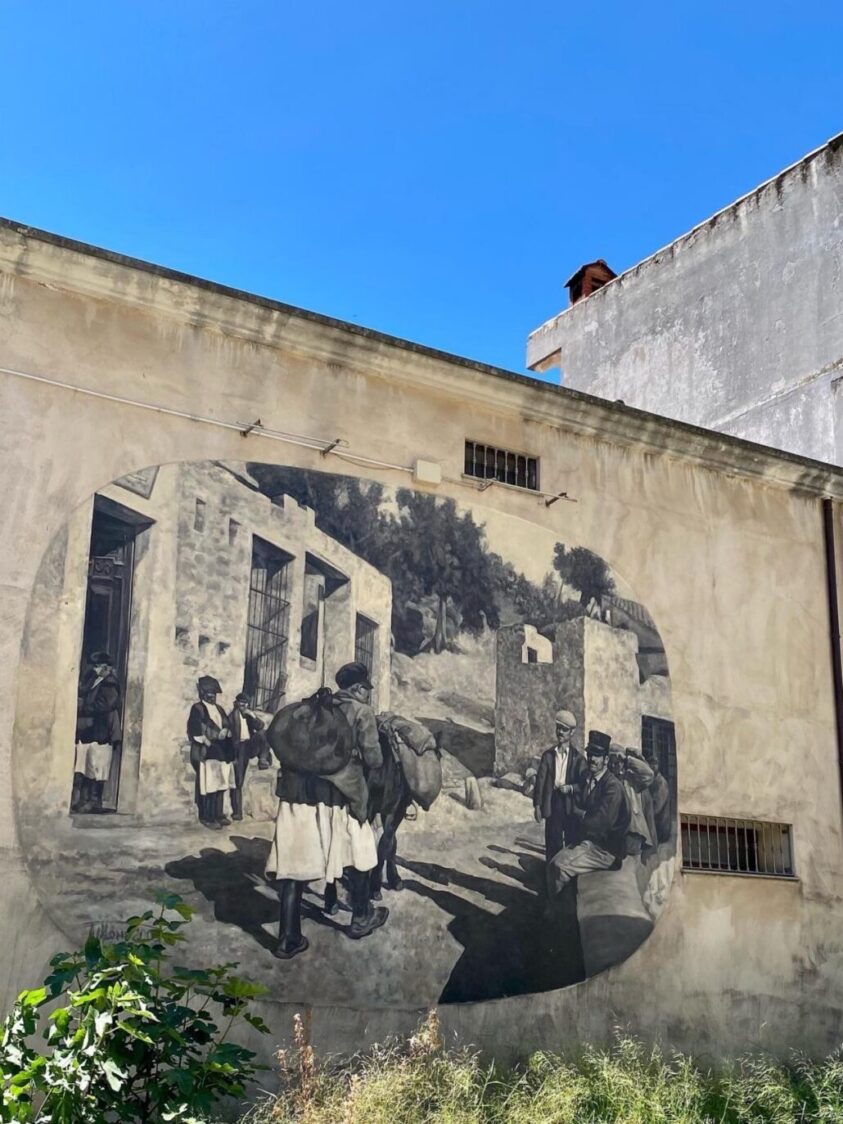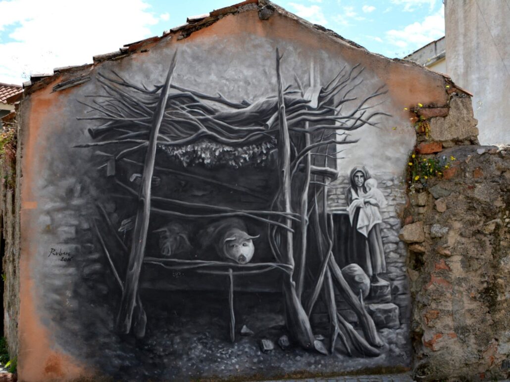Les fresques, presque toutes en noir et blanc, ont été réalisées par des artistes sardes, souvent originaires du village. Elles représentent des scènes de vie rurale, des traditions, des gestes simples, parfois la figure du bandit. Peu de femmes, peu de scènes domestiques. L’essentiel est ailleurs : dans les regards, les postures, la dignité.