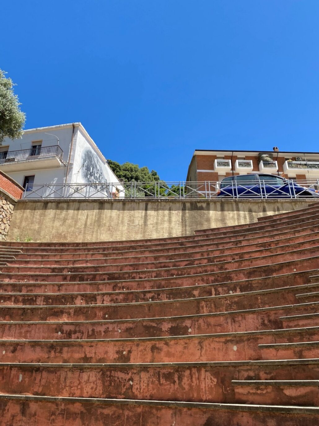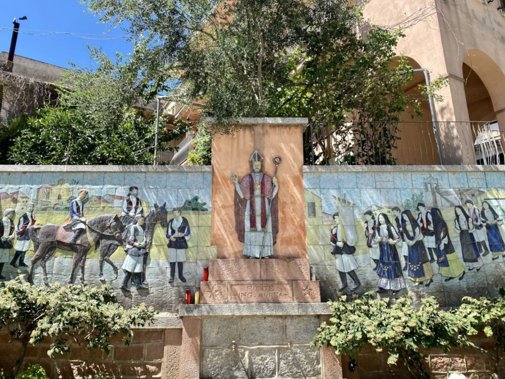 On se retrouve sur la Piazza Fontana, face à l’amphithéâtre historique. Un petit marché anime la place. On gare la voiture et on part à pied. Devant nous, les maisons s’alignent à flanc de colline, dominées par la chaîne du Supramonte. Le décor est puissant, sans ostentation.