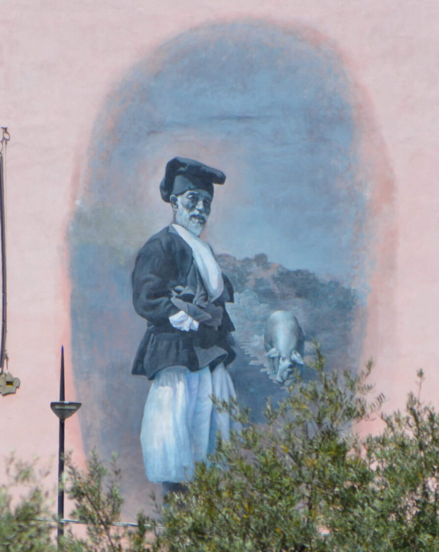 👉 Antoni Manca, ancien porcaro d’Urzulei, incarne la Sardaigne pastorale des années 1930. Son visage, marqué par le temps et le travail, raconte une vie rythmée par les saisons, les bêtes et la montagne. À travers cette image, ce n’est pas un métier disparu que l’on regarde, mais une mémoire vivante que le mur refuse d’oublier.