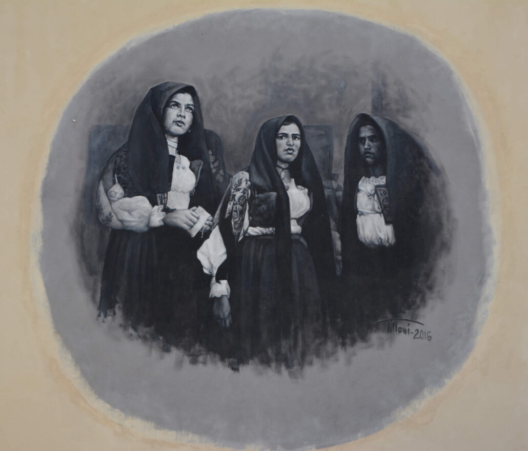 👉 Maria Murcone, photographiée en habit traditionnel, incarne l’élégance sobre et la dignité silencieuse des femmes d’Urzulei dans les années 1930. À travers le tissu, la posture et le regard, c’est tout un monde de gestes transmis et de rôles essentiels qui affleure. Le mur ne fige pas une image folklorique : il redonne un visage et un nom à la mémoire du village.