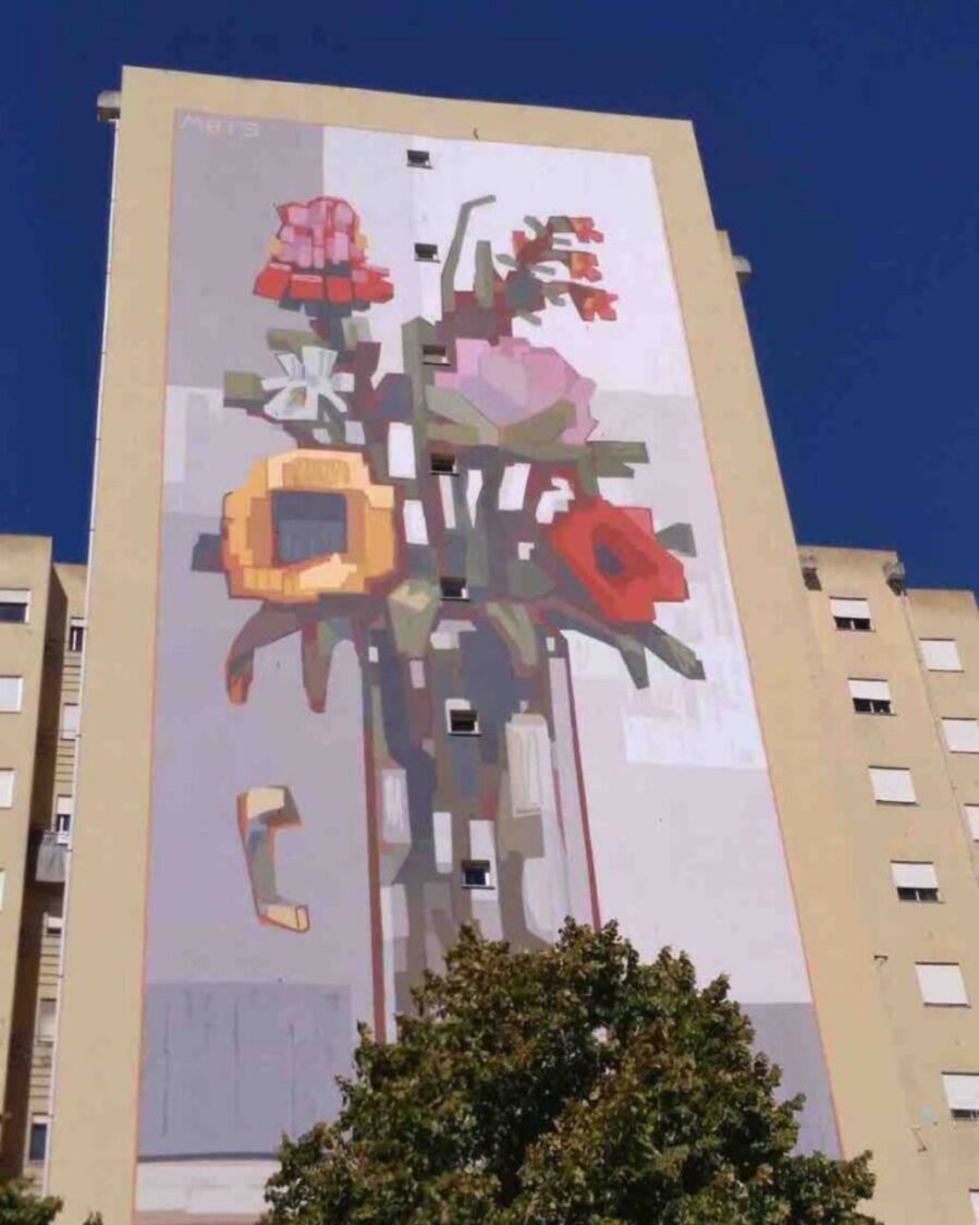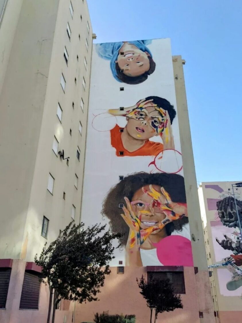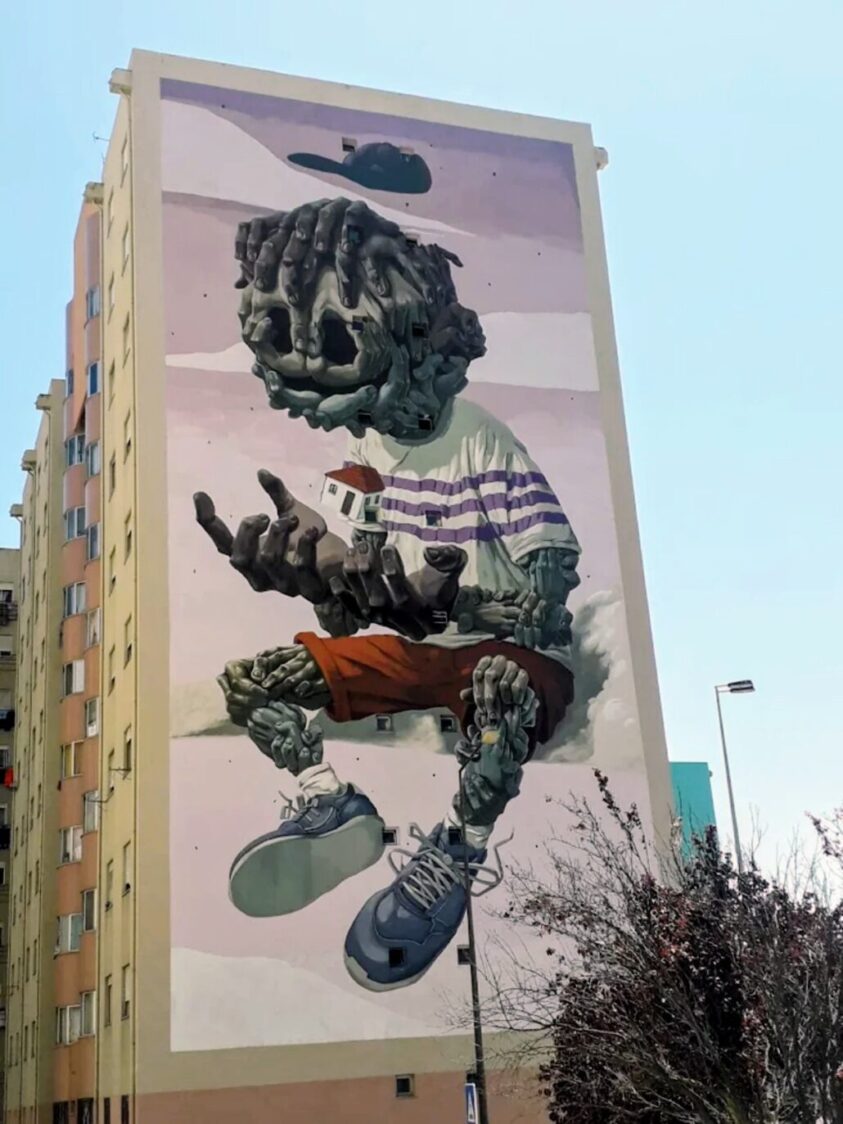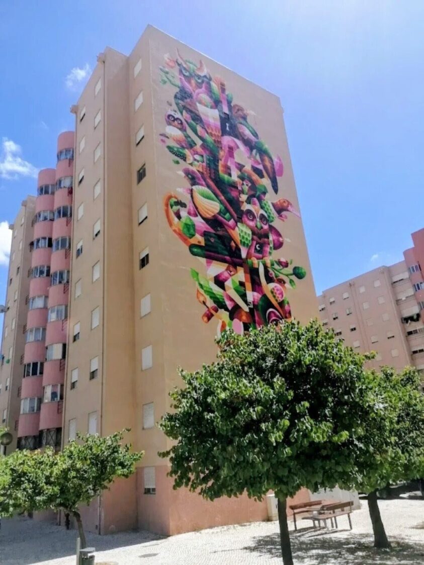 Description : La fresque d’Eelco van den Berg capte immédiatement le regard par son tourbillon de couleurs et de formes organiques. L’artiste néerlandais y mêle motifs urbains et éléments presque surréalistes, créant une scène où tout semble en mouvement, comme si la façade respirait au rythme de la ville. Les contours précis et la palette vibrante donnent à l’ensemble une dimension à la fois ludique et poétique, invitant le spectateur à se perdre dans un univers où architecture, imagination et nature se répondent harmonieusement. Cette œuvre transforme le mur en célébration visuelle de créativité et de diversité, fidèle à l’esprit du festival MURO LX.