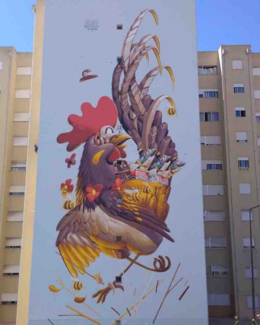 Description : La fresque de STOM500 conserve son caractère fantaisiste et ludique, intégrant plusieurs symboles emblématiques du Portugal, comme le coq, les sardines, et d’autres éléments culturels. Par son style animé et coloré, elle mêle humour et référence au patrimoine portugais, tout en restant fidèle à l’univers graphique de l’artiste.