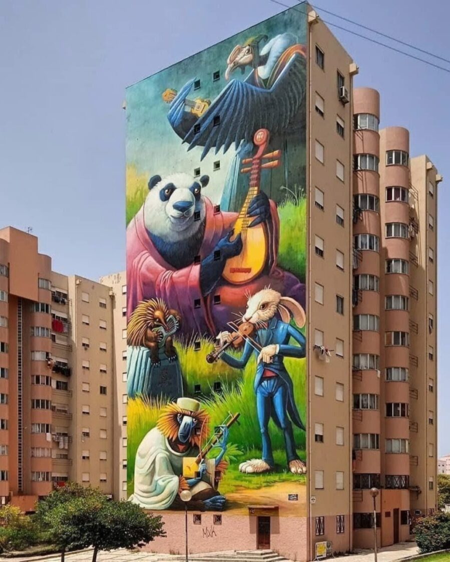 Description : La fresque de Juan José Surace déploie un véritable quintette mural à ciel ouvert. Cinq animaux venus des quatre coins du monde jouent chacun un instrument traditionnel de leur continent, réunis dans une harmonie improbable mais parfaitement orchestrée. Le réalisme des visages, la précision des textures et la chaleur des couleurs donnent l’illusion que la musique pourrait s’échapper du mur à tout moment. Plus qu’une simple scène musicale, l’œuvre célèbre la rencontre des cultures et rappelle que, lorsqu’on accorde les différences, le monde sonne tout de suite beaucoup plus juste.